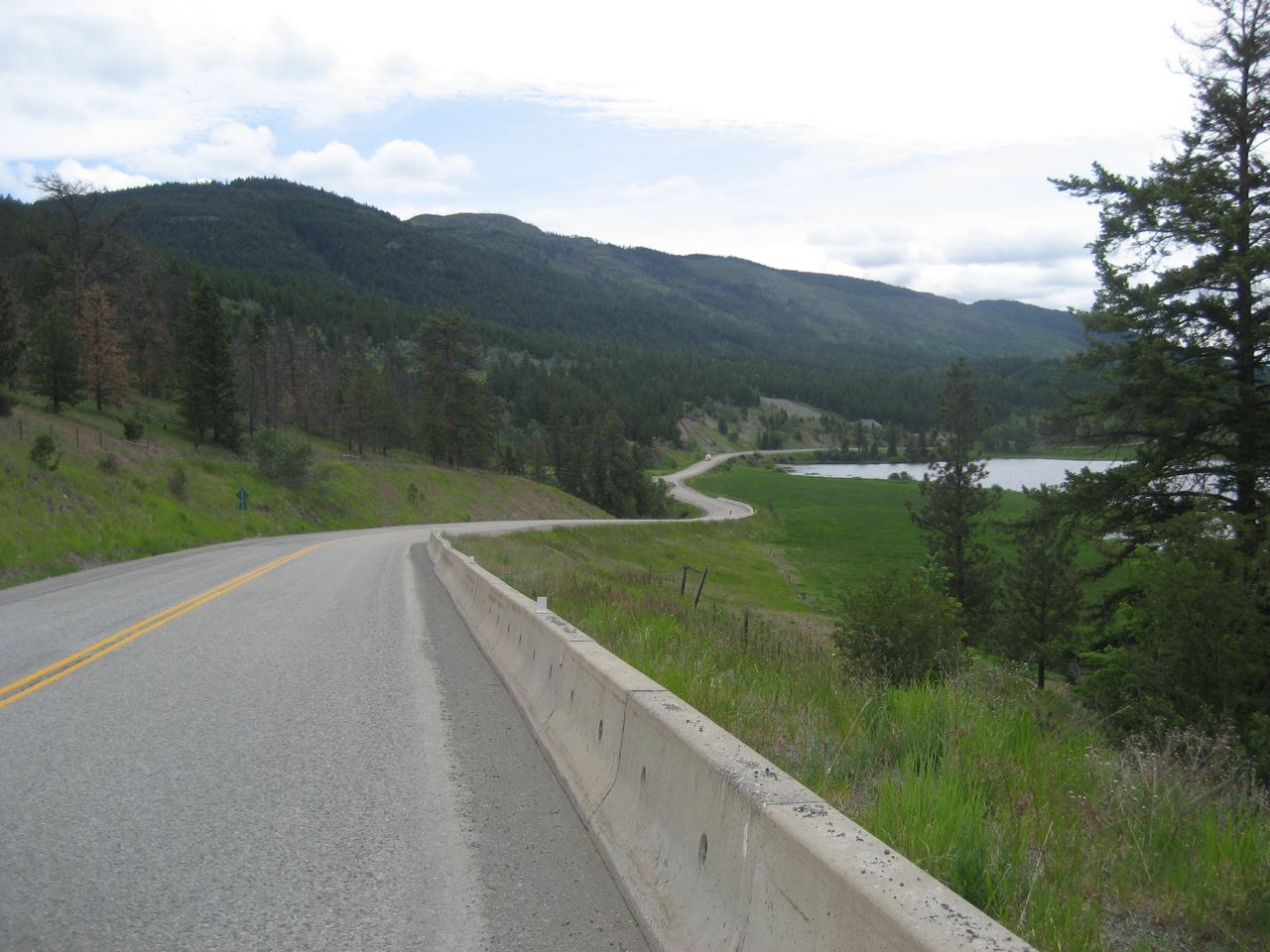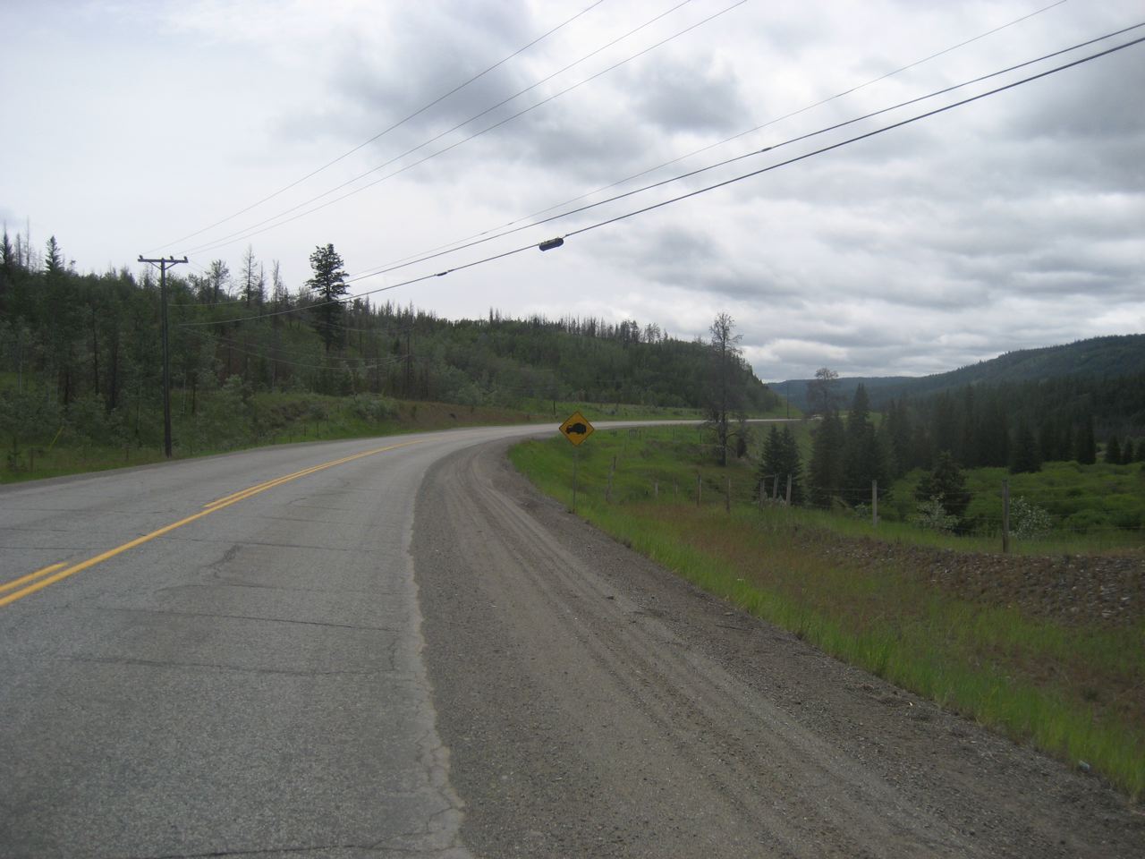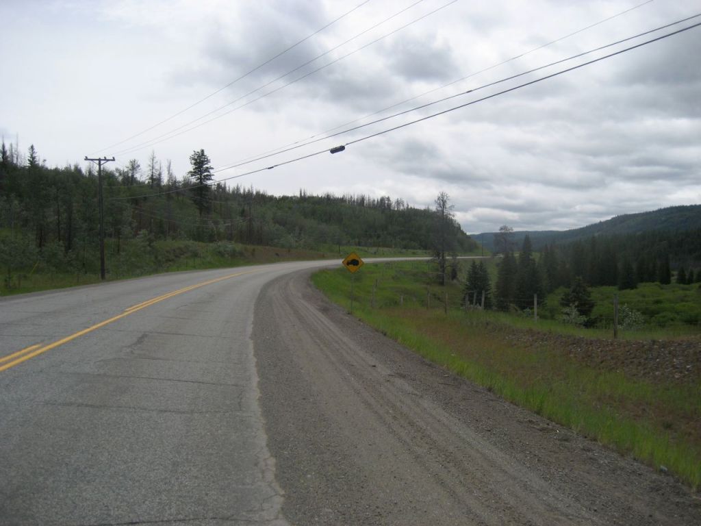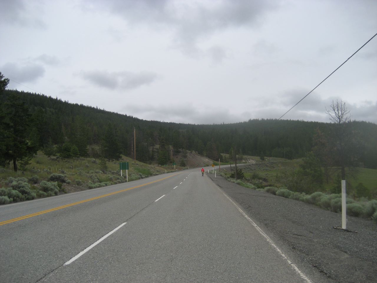The headwind doesn’t let up – in fact, it gets worse. After Logan Lake, Route 97C heads directly south, straight into the wind for 40 km. Nothing but trees, rolling hills and a few horses.