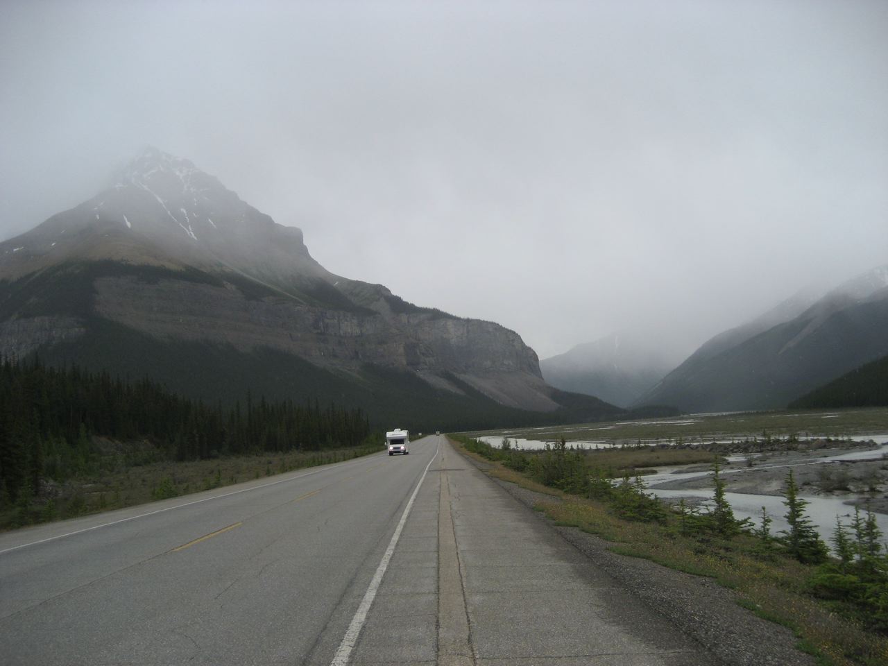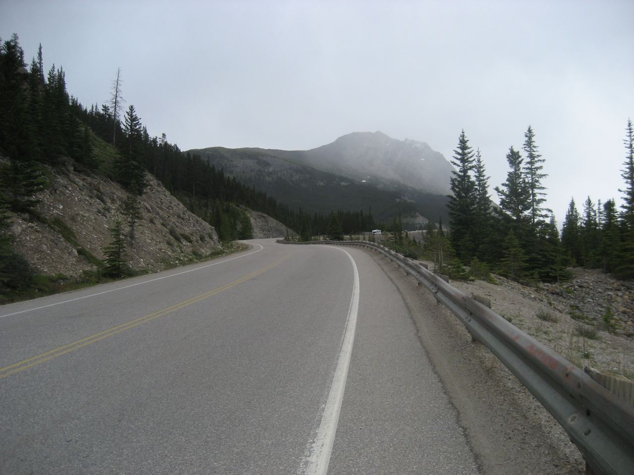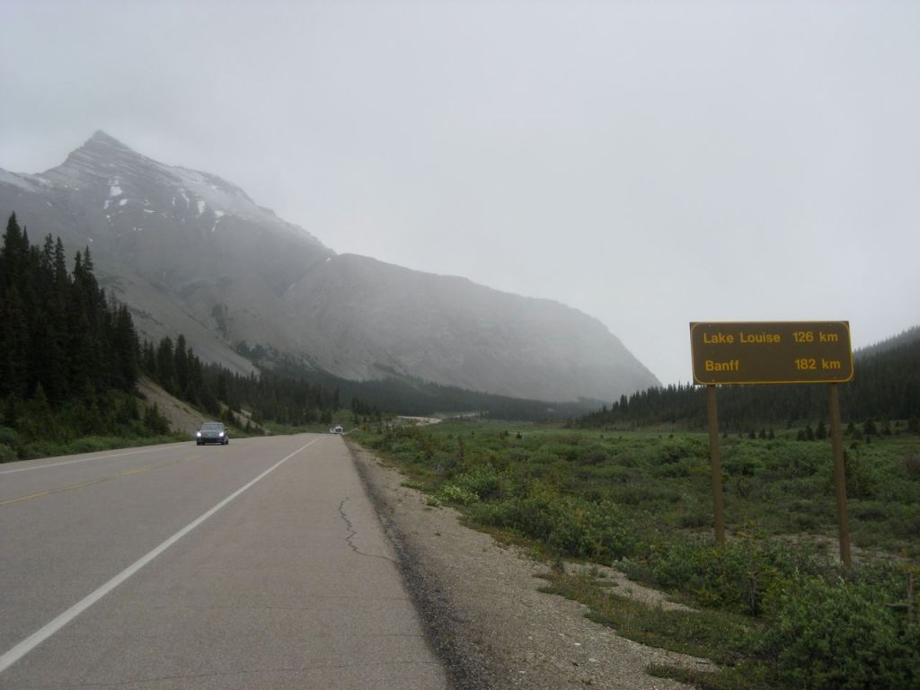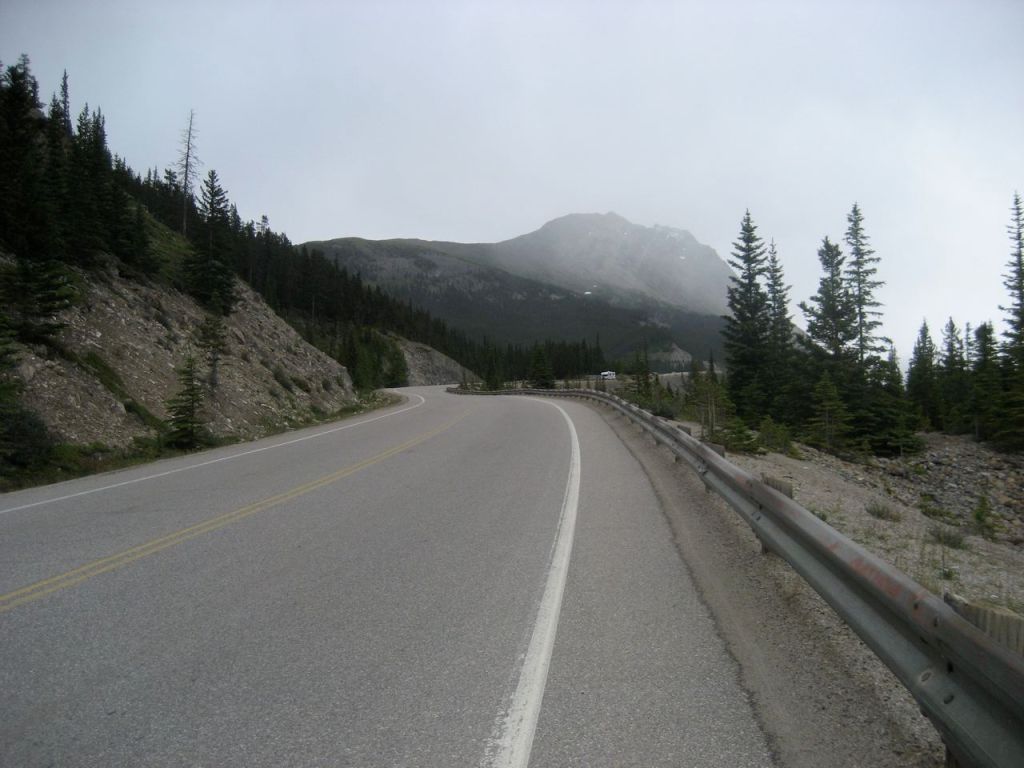 After 90 km I get to Sunwapta Pass, a steep 4 km climb and the toughest one of the day. As I approach the summit, the rain turns to hail, and I grind through a stiff headwind the rest of the way to camp.