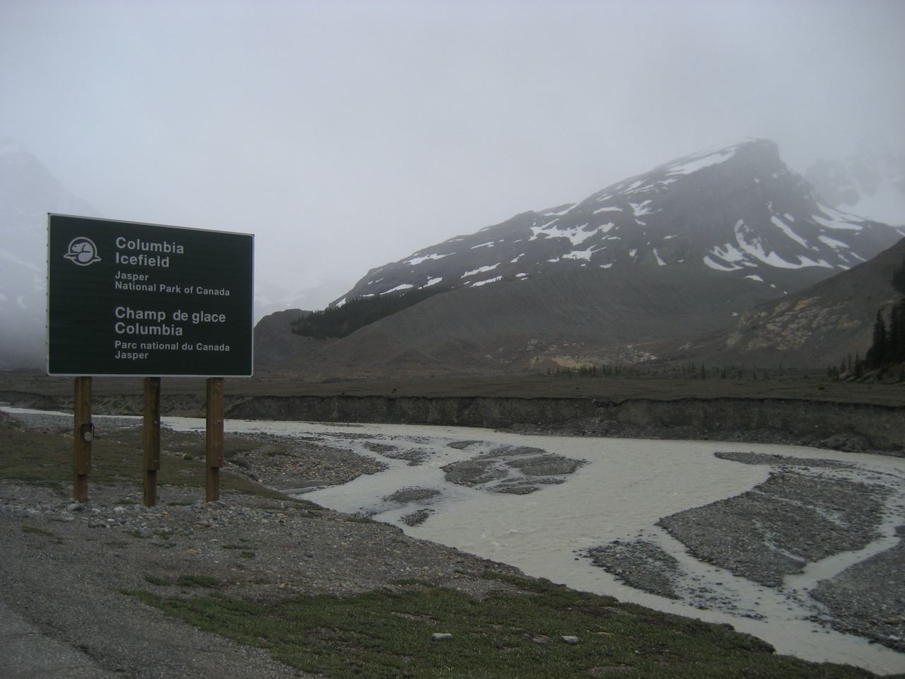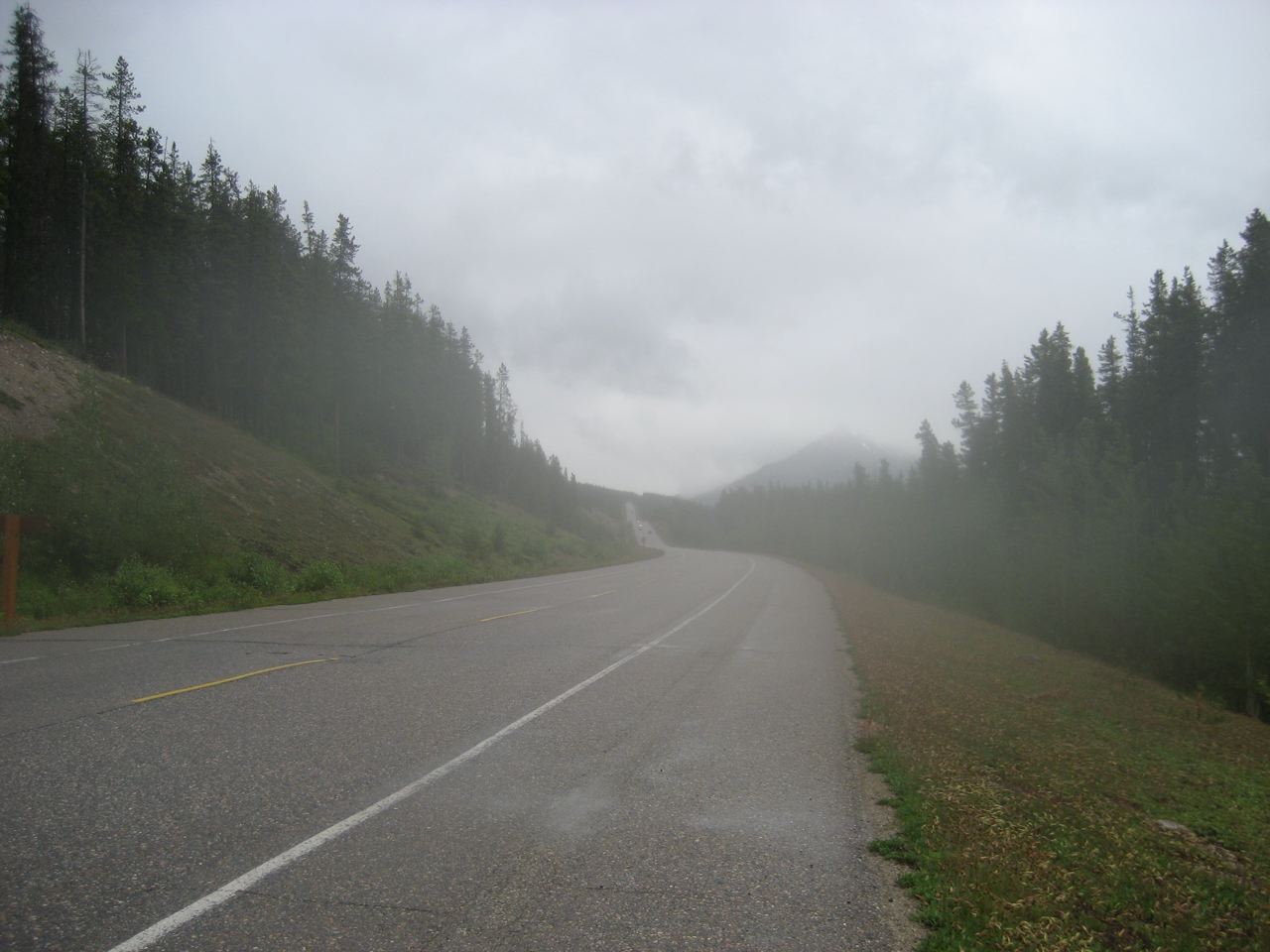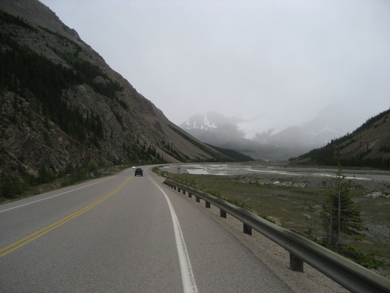 After 90 km I get to Sunwapta Pass, a steep 4 km climb and the toughest one of the day. As I approach the summit, the rain turns to hail, and I grind through a stiff headwind the rest of the way to camp.