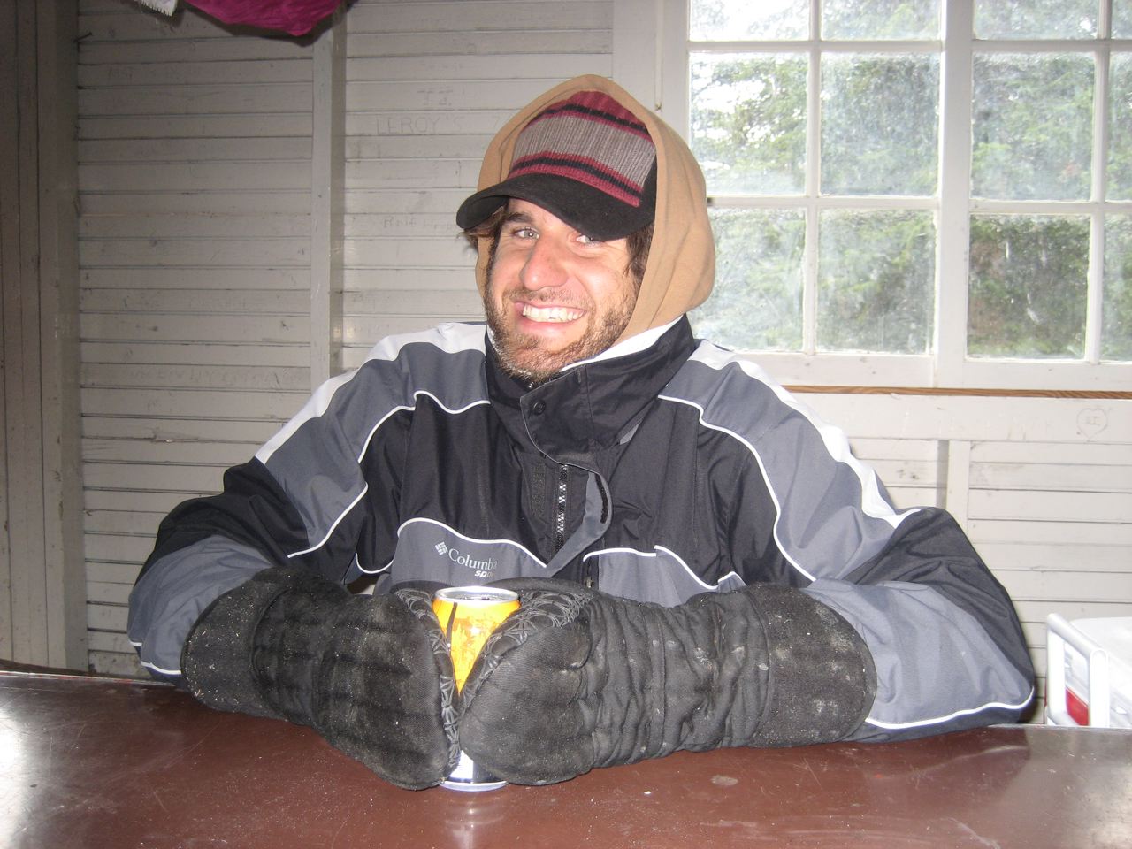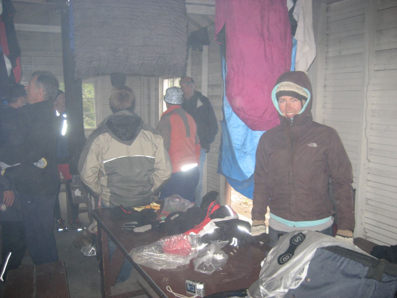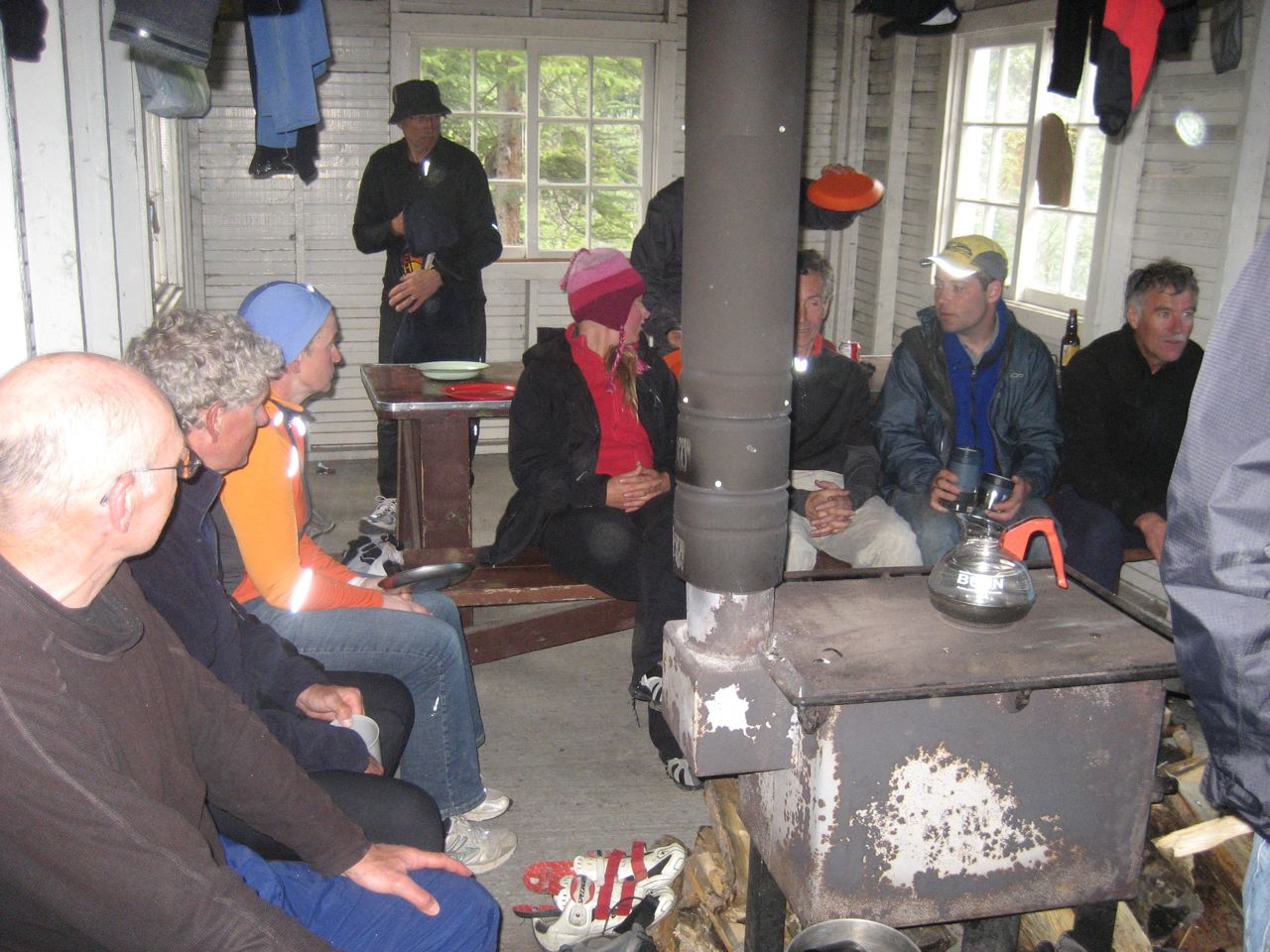 The wood stove in the cookhouse works wonders for drying wet shoes and lifting our spirits after such a tough day. Jackets, socks and bike jerseys hang from a makeshift clothesline overhead as we devour a delicious meal of burritos and peach cobbler.