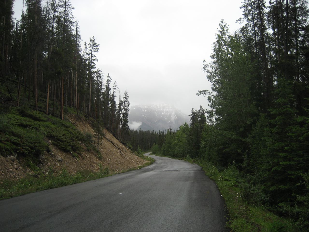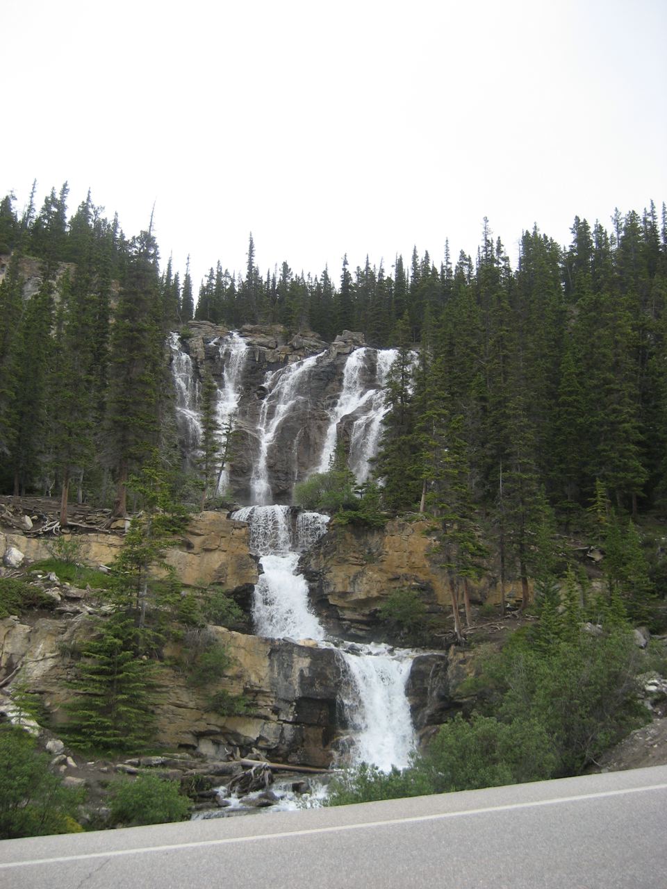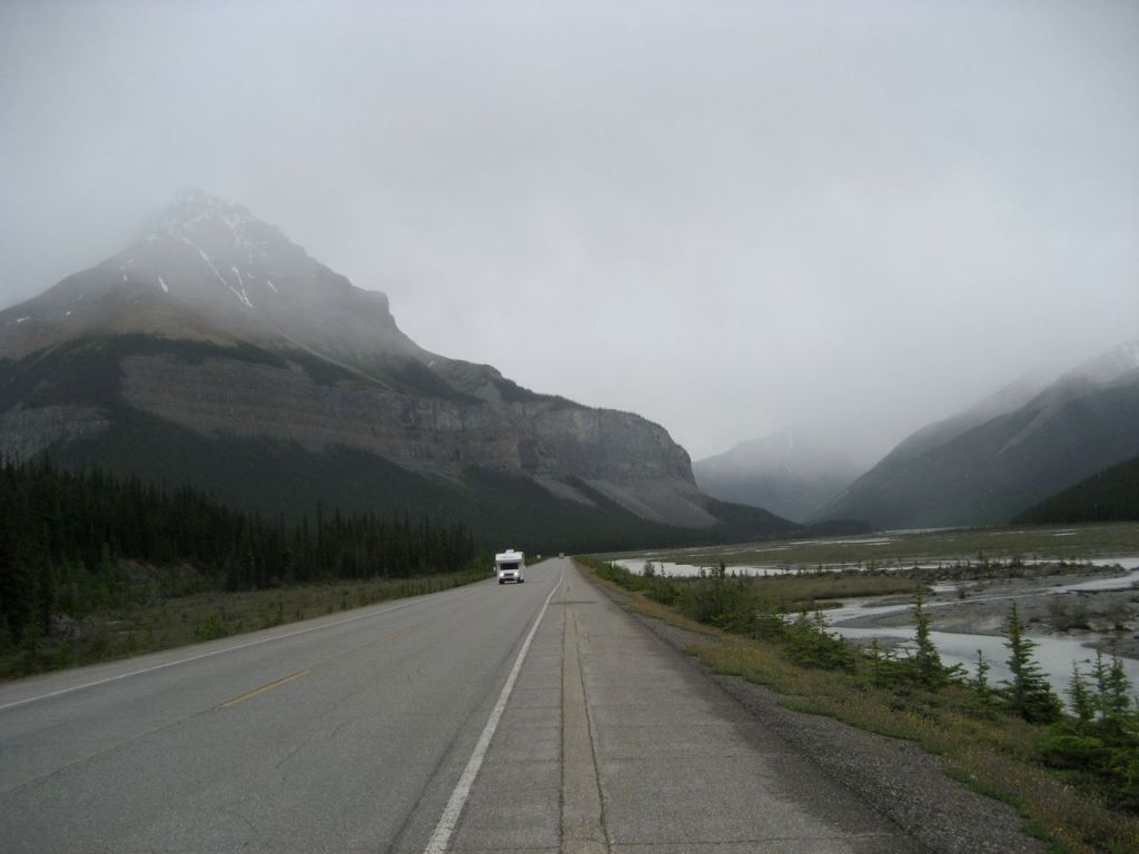 I struggle to stay warm on the wet, hilly Highway 93. My feet feel like blocks of ice and my hands aren’t far behind. Reaching Sunwapta Falls, the only stop of the day at 53 km, seems like a monumental task.