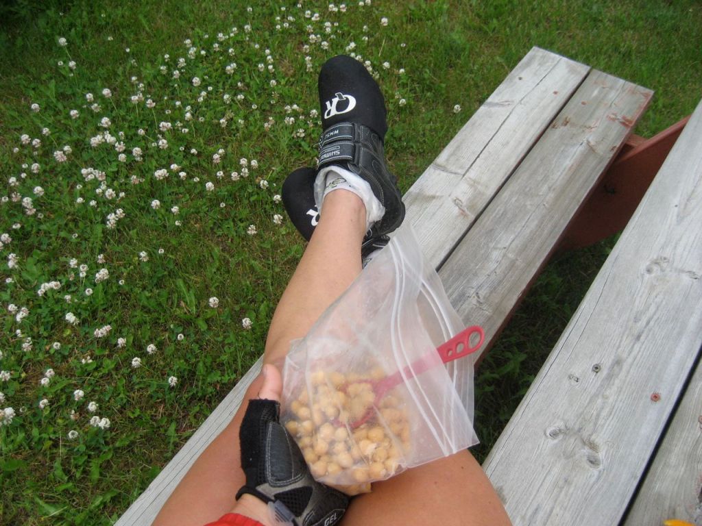 In an attempt to increase my calories, I’ve started eating chickpeas straight out of the can with a spoon. Or in the case of today, straight out of a sandwich bag. They’re surprisingly satisfying.