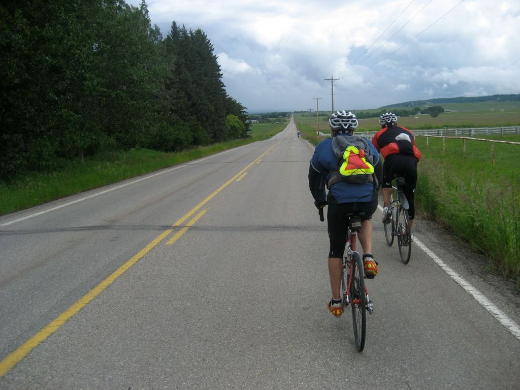 We stop in Cochrane just 20 km later for a longer break and meet up with Fred at Tim Hortons. He joins us from that point on and the three of us stick together to battle the relentless headwind.