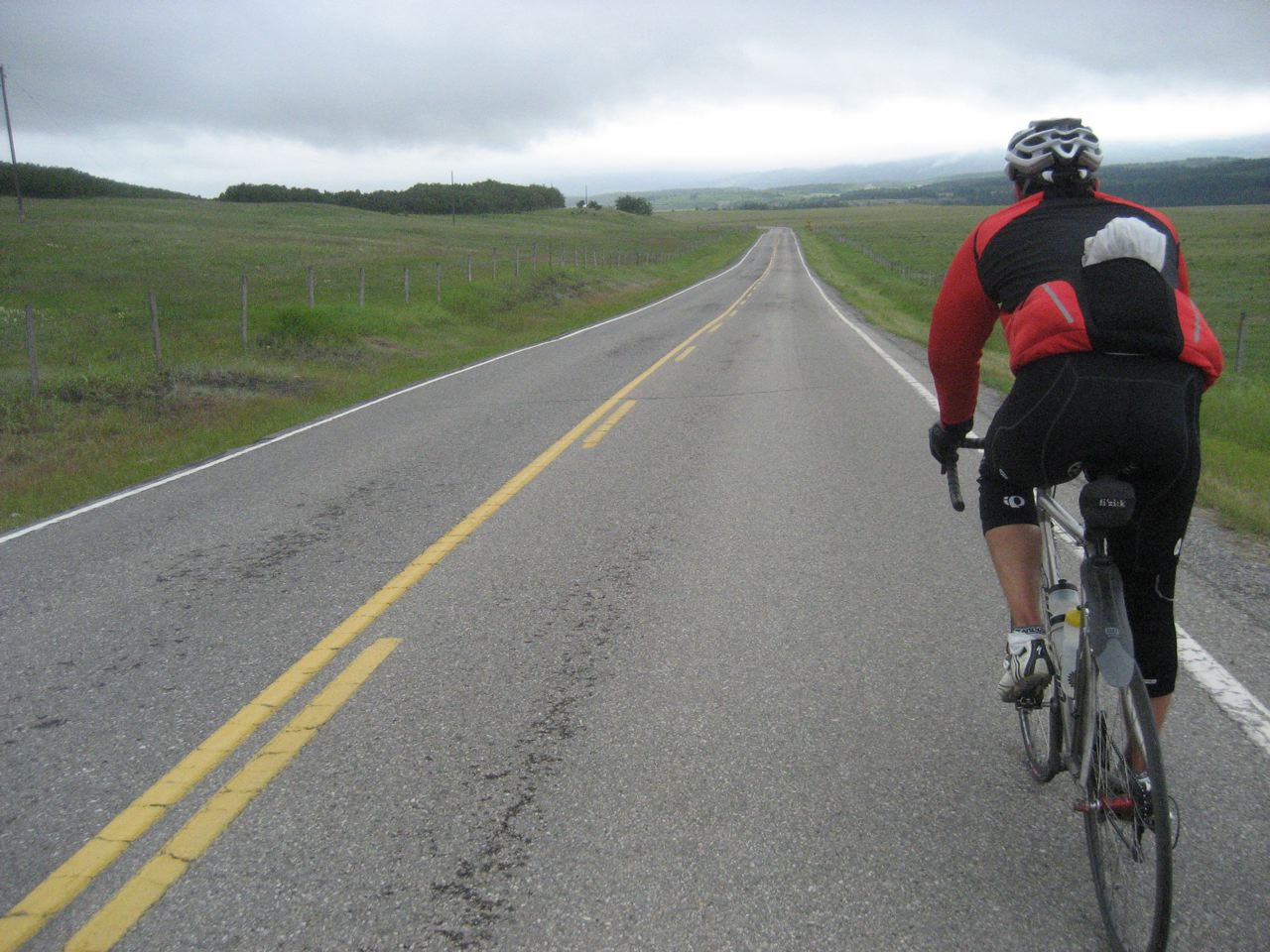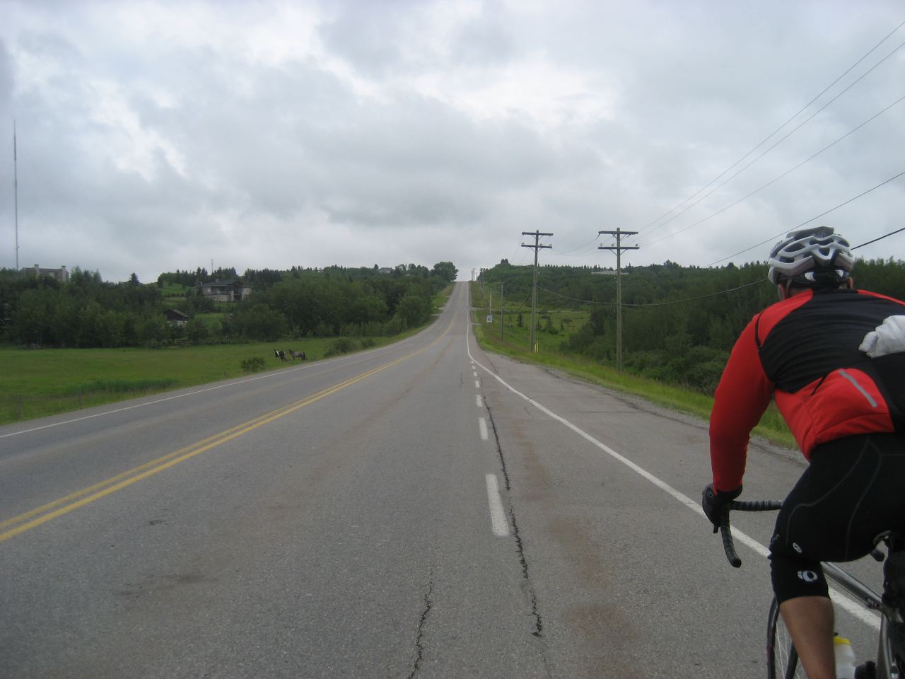 We stop in Cochrane just 20 km later for a longer break and meet up with Fred at Tim Hortons. He joins us from that point on and the three of us stick together to battle the relentless headwind.