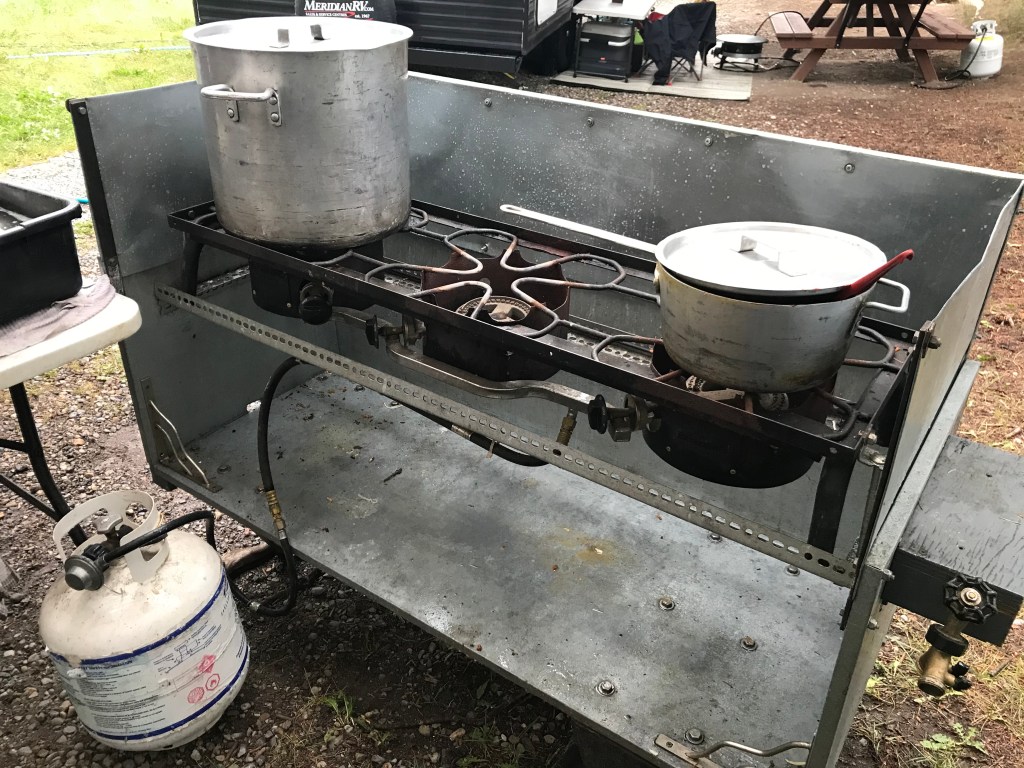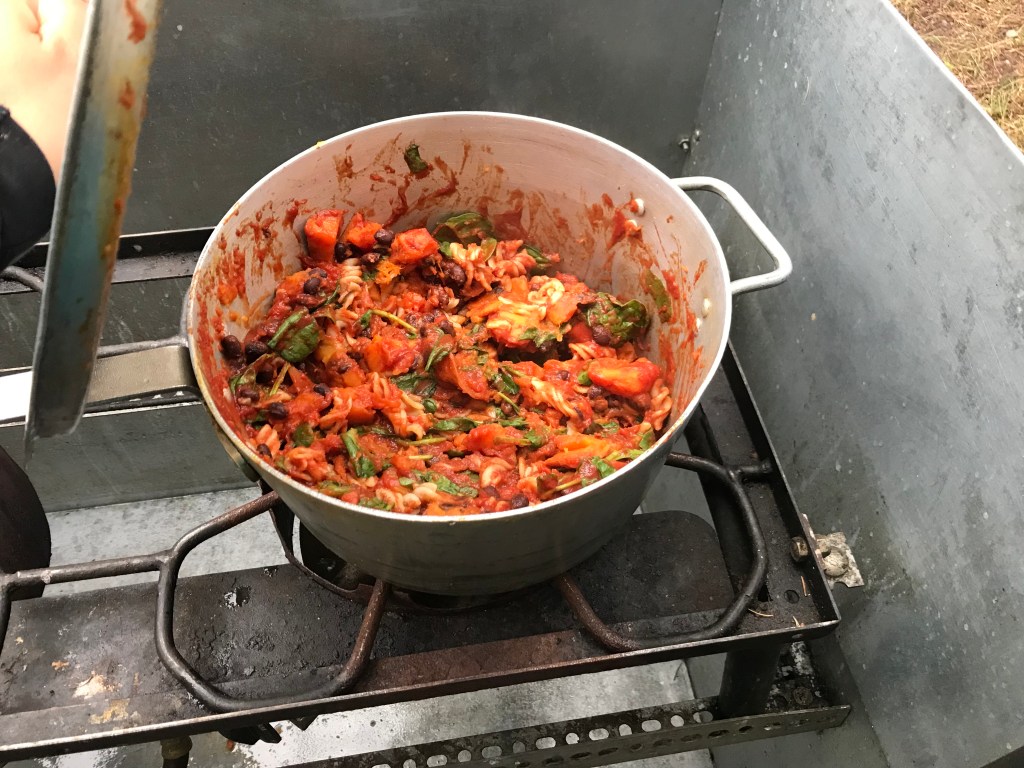 I get back to the campground around 4 just as the rain starts up again. I take shelter in my tent for an hour until it clears up, then I head to the trailer and make a pot of pasta. Every time we cook on this stove, the first step is to put a big pot of water on to boil so we’ll have dishwashing water ready when we need it.