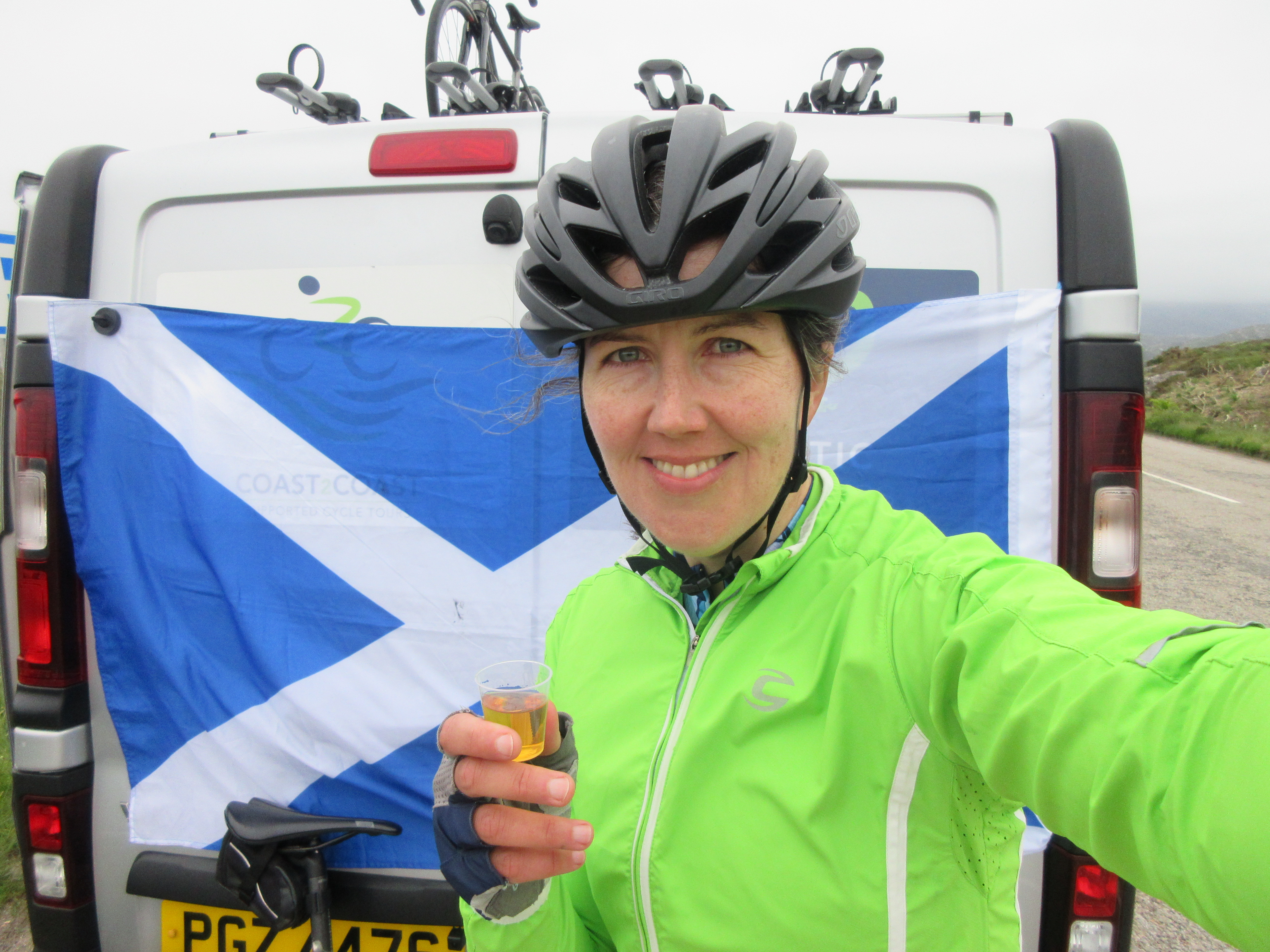 With 36 km to go, I’m feeling completely spent. I’m ready for this ride to end but the hills aren’t over quite yet. At the top of the next one, I see a familiar van parked at a lookout with Fiona standing next to it waving me in. She explains that I’ve reached the halfway point of the tour and we’re celebrating with a dram of whisky for each of us. It warms me up nicely before I head on my way.